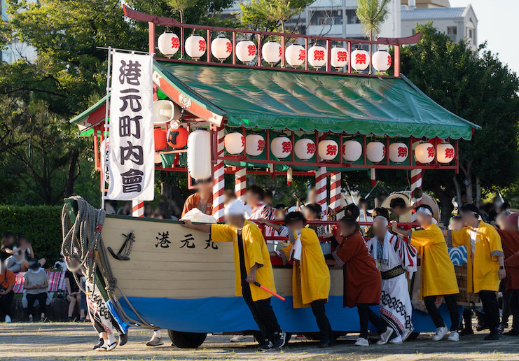 築地の社(やしろ)に祈りを捧げ、神依松(かみよりまつ)に招かれながら、踊り浴衣の艶姿(あですがた)、粋な姉(あね)さん方の三味の音(しゃみのね)。鐘、太鼓、小太鼓の競演は、唄って踊って、港元町内自慢の屋形流しです。